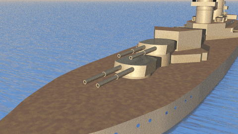 | アイアンデュークの主砲塔、45口径34.3cm連装砲塔はKGV級以降に新設計された改良型でオライオン級戦艦の34.3cm砲弾の567kgより12%重い635kgの砲弾を装填可能です、その砲弾を21700mまで飛ばせ、9100mの距離においては320mmの装甲を貫通できたそうです。アイアンデュークはその45口径34.3cm連装砲塔を艦首から艦尾にかけての中央直線状に5基配置されています(KGV級も同じ)。 | ||||