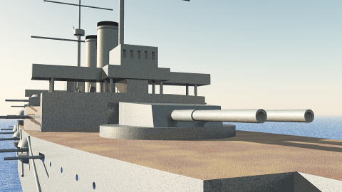 | 朝日はこの40口径30.5cm砲を連装砲塔に収め当時戦艦、巡洋艦の一般的な主砲配置でる艦首と艦尾の甲板上に1基づつ計2基4門配置しています。 |