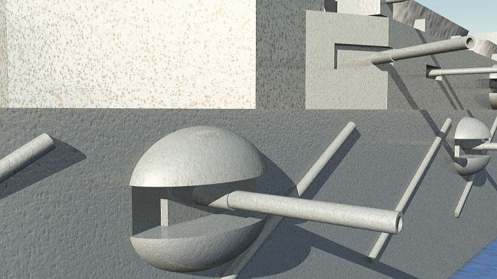 | 更に敷島には駆逐艦の様な小型艦艇を標的とした40口径76.2mm砲を側面及び甲板上に計20門も装備されています、この76.2mm砲は至近距離での大型艦甲板構造物攻撃にも約にたっていました。発射速度も毎分15発と砲弾装填の非常に早い速射砲でした。 | ||||