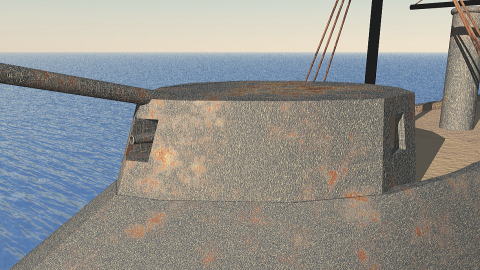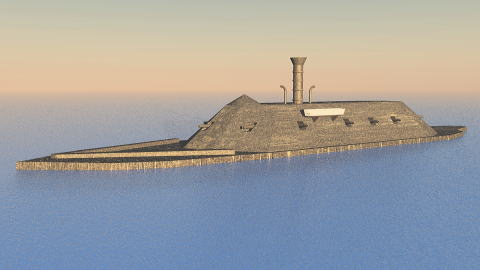 | アメリカ南北戦争中にスウェーデン技師「ジョン、エクソン」により設計された北部海軍の装甲艦です、船体は鋼鉄により全て装甲が施され甲板には当時世界最初の回転式の砲塔が搭載されています、その砲塔内には2門の28cmダールグレン滑腔砲が格納されています、わずか2門の大砲ですが周囲8方向へ砲門を向けられる為に10門以上の砲を搭載したのと同じ装備です、船体は喫水線が非常に低く船体の大半が海中に沈みこんだ状態で更に甲板上には砲塔以外に目立った突起物は在りません(煙突は収納式です)、これは敵の砲弾を避ける為の構造です、以後この様な小型の船体に1基ないし2基の砲塔に巨砲を格納した艦をモニター艦と呼ぶようになりました、モニター艦は河川での戦闘や陸上への艦砲射撃で大いに活躍しています。 | ||||