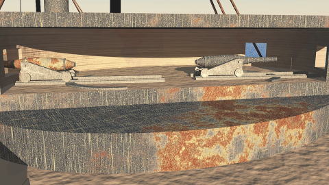 | 新政府に引き渡されたストーンウォールは「甲鉄」と呼ばれました、その装備は艦の前方と後方に一箇所ずつ固定式砲塔が配置され前方部砲塔には28cmものアームストロング社製前装式滑腔式砲1門、後部砲塔には同じくアームストロング社製12、7cm前装式ライフル砲2門を装備しています、これら大砲は砲塔内に敷かれているレールにより方向を変える仕組みです。 | ||||
