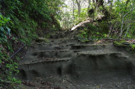 | 海蔵寺岩船地蔵堂から直進してJR横須賀線の高架をくぐりそこから海蔵寺へ向かう道を150m程進んだ所に左に曲がる道が在りそこを左折して300m程先が化粧坂です、化粧坂の意味は此処で平家の大将の首に化粧をした、この辺りに遊女がたくさんいた、など幾つかの説があります、上記の写真でわかる様に岩はむき出し路面はボコボコの坂道で開通工事はかなりの難工事であった様です。 |