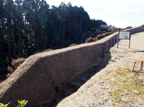 | 北ノ郭から西ノ郭の下手まで大土塁が連なっています、本郭、ニノ郭の北側の守りで土塁上は帯郭となっています。 |